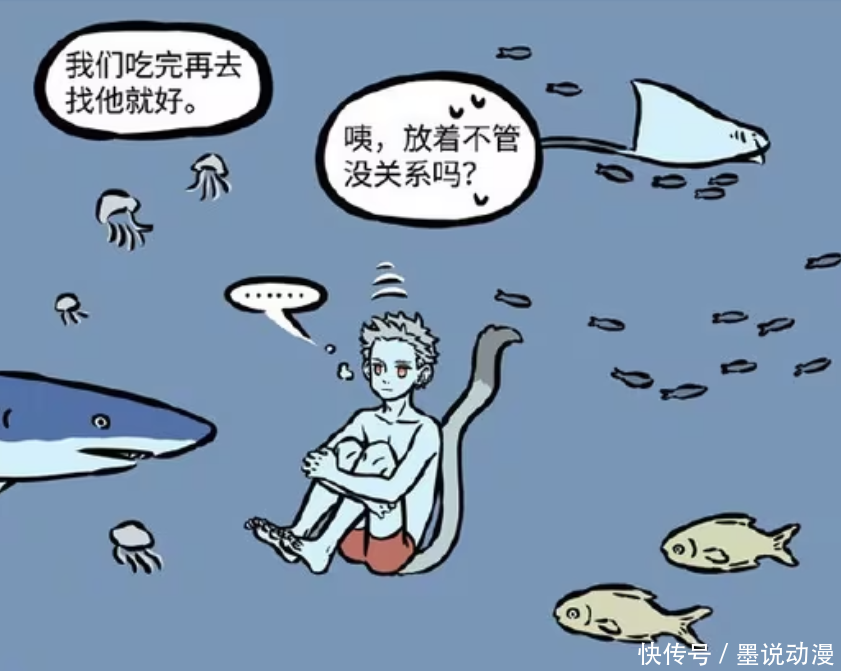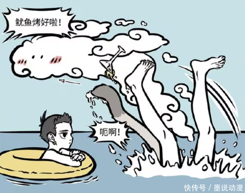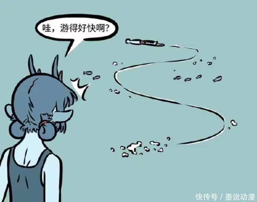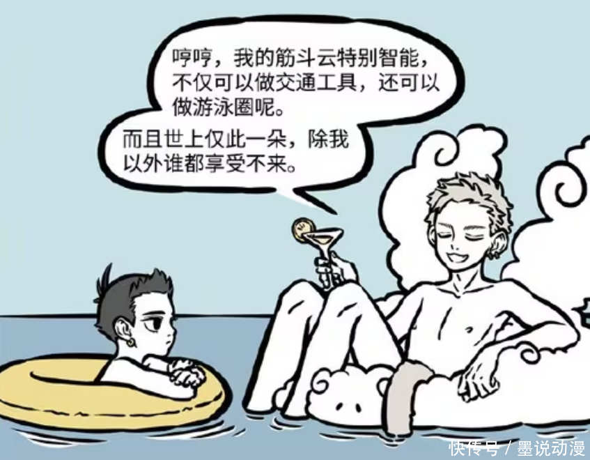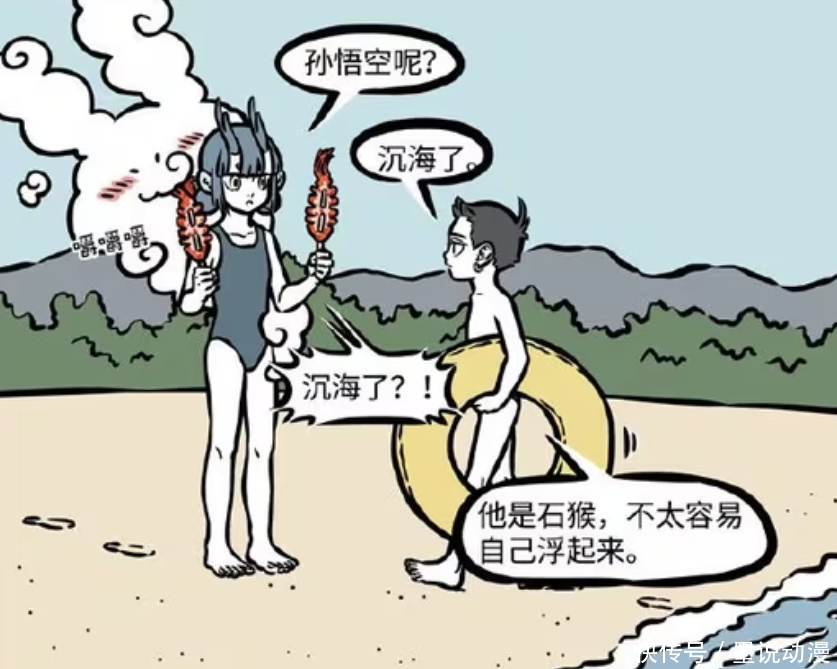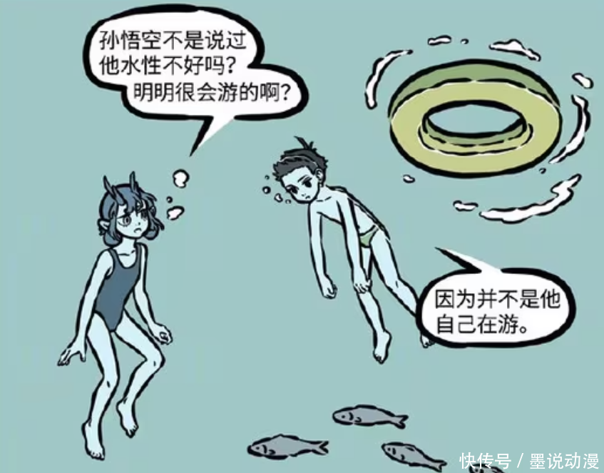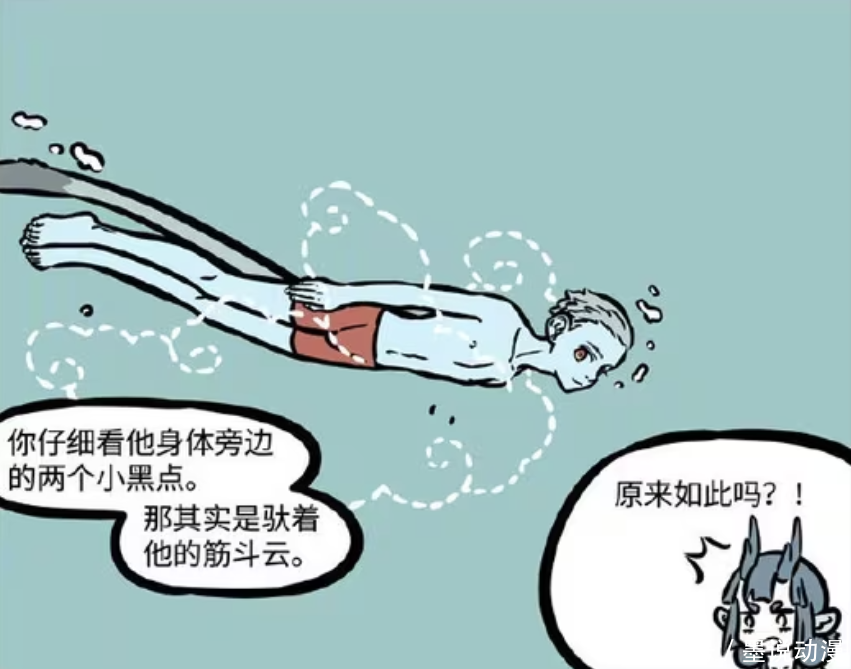 《非人哉》漫画版,孙悟空水性突然变好?连龙女都觉得他的水性变得太好。其实并不是孙悟空水性变好,而是筋斗云驮着他游泳。只要筋斗云被美食吸引,孙悟空就只能沉海底。