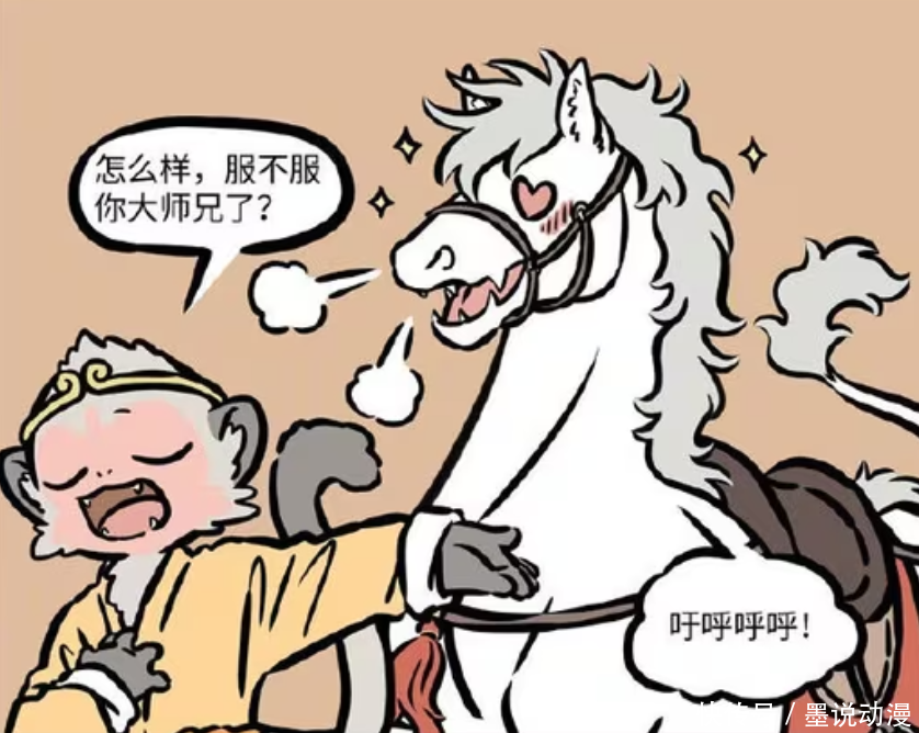 《非人哉》漫画版,孙悟空和敖烈相识之初,敖烈并不喜欢孙悟空。不过在孙悟空号称世界顶级弼马温,用专业顶尖的养马技术,让敖烈被征服。哪怕是西天取经结束一千多年,敖烈最爱的人都是孙悟空,就是家里都囤着一屋子的孙悟空周边。