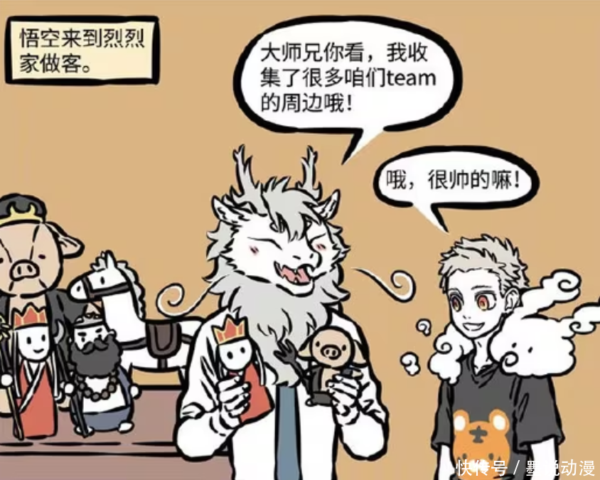 孙悟空也经常去敖烈家做客,毕竟两人的关系还是很不错。敖烈很喜欢西游组,所以收集了很多他们组的周边。孙悟空一开始,觉得这些玩偶很不错,毕竟有师傅唐三藏、师弟猪八戒和沙和尚都在里面。