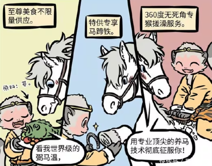 其实并不是,孙悟空只是想展示什么叫世界级弼马温?先是至尊级美食不限量供应,当然原料就是草,可以看作是是顶级草料。再来是提供专享马蹄铁,让敖烈跑起来更舒适。再来就是三百六十度无死角的搓澡服务,这样一来,敖烈就被孙悟空顶尖的养马技术给征服。