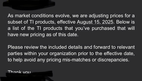 As market conditions evolve, we are adjusting prices for a subset of TI products, effective August 15, 2025. Below is a list of the TI products that you've purchased that will have new pricing as of this date.